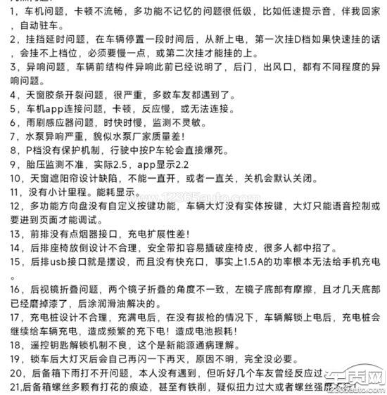 1、刹车卡顿,售后检测承认存在刹车卡顿情况,但厂家承认由于液体缺失导致的刹车压力突变,导致刹车卡顿,但厂家以没有解决办法为借口,不予处理。由于刹车卡顿,已经导致车主在行驶过程中无法通过踩刹车踏板有效控制车速,差点撞到行人。(就是因为这样的经历,才特意检查刹车状况)。2、车辆后部异响,售后不保证拆车维修能够解决异响。3、车机app经常出现控制异常。4、车辆续航虚标严重。车辆参数标注续航501,而实际充满电续航437公里。
