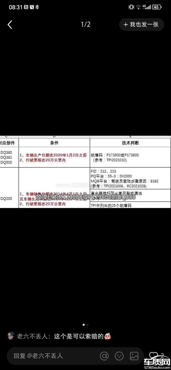 2017年11月购买的Tiguan四驱车,行驶里程约4.8万公里。2025年7月16日在正常行驶中突然显示:变速箱处于紧急运行模式,可以继续行驶。车辆抖动、顿挫,油耗飙升,同时,挡位只有2、4、6和倒挡。后至大众4S店检查后告知:变速箱机电单元出现问题,故障码是P173500,需要更换TCU,并要支付近三万元的各种费用。此问题是Tiguan的通病,是出厂质量问题,应该召回并免费更换。诉求:1.加快配件供货时间;2.免费更换(因为出厂质量问题,大众应免费提供配件,既然是质量问题,因此产生的工时费理应免除);3.适当补偿等待维修期间的通行费用。进口大众无视大家的诉求,建议大家多投诉,同时通过国家质检总局,缺陷信息报告上报了这个车缺陷。只有集中上报才能引起重视。