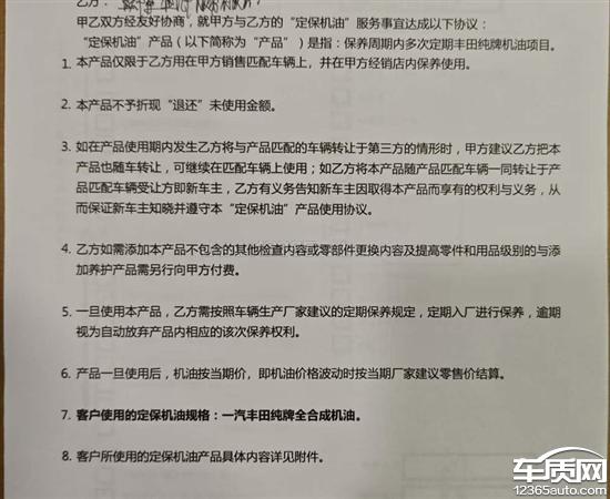 今年一月份,我在宜兴新苏南一气丰田购买了一台格瑞维亚。在购车时,送了价值一万元的全合成机油,买车时,我也没有多想,反正都是熟悉的。3000公里去保养时,车开进去一会就出来了,说只是检查不换机油说是厂家的要求。后来经过强烈要求帮我机油换了(第一次换机油是厂家免费的),可当车辆行驶到13000公里保养时接待人员说你的车没有免费保养需要自费。我说我有一万的保养啊,他说赠送的机油可以直接用,但更换机油的工时费是380元,这是行业常规收费。机油滤芯属于易损件,不在赠送礼包里,得花钱换一个新的。这个时候我才反应过来,只是送你机油,其他都要另外收费,加起来500多。而且一定要在他们店里保养,也就是说你一定要接受他们的工时费和机油滤芯等等费用。因为在我们一般认知里面保养是机油,机油滤芯工时费不可分开的。后来看了销售合同和另外的协议,第一份是赠送10,000的全合成机油没有说一定要在店内保养,第二个协议内容意思除了更换机油外更换,其他需要收费。目前拒绝做保养,一定要另外进行付费