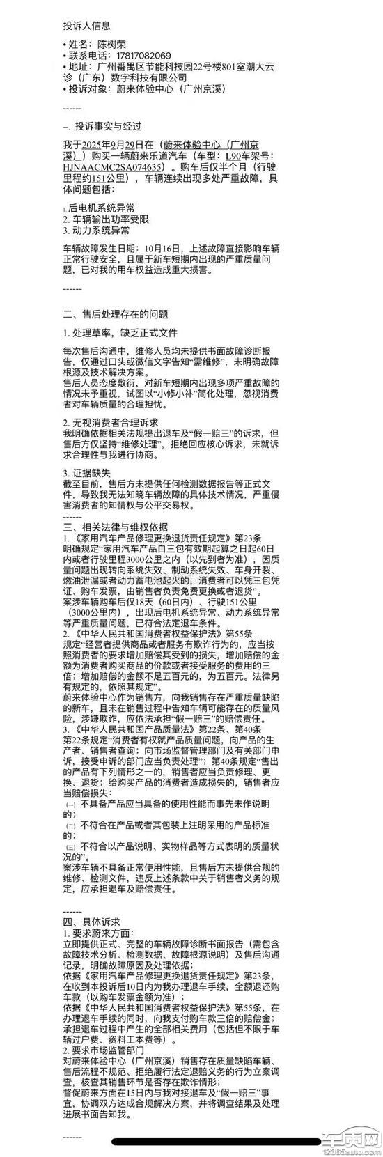 投诉对象:蔚来体验中心-、投诉事实与经过我于2025年2月29日在蔚来体验中心购买一辆蔚来乐道汽车(车型:L90车)。购车后仅半个月(行驶里程约151公里),车辆连续出现多处严重故障,具体问题包括:1.后电机系统异常2.车辆输出功率受限3.动力系统异常车辆故障发生日期:10月16日,上述故障直接影响车辆正常行驶安全,且属于新车短期内出现的严重质量问题,已对我的用车权益造成重大损害。二、售后处理存在的问题1.处理草率,缺乏正式文件每次售后沟通中,维修人员均未提供书面故障诊断报告,仅通过口头或微信文字告知“需维修”,未明确故障根源及技术解决方案。售后人员态度敷衍,对新车短期内出现多项严重故障的情况未予重视,试图以“小修小补”简化处理,忽视消费者对车辆质量的合理担忧。2.无视消费者合理诉求我明确依据相关法规提出退车及“假一赔三”的诉求,但售后方仅坚持“维修处理”,拒绝回应核心诉求,未就诉求合理性与我进行协商。3.证据缺失截至目前,售后方未提供任何检测数据报告等正式文件,导致我无法知晓车辆故障的具体技术情况,严重侵害消费者的知情权与公平交易权。------三、相关法律与维权依据1.《家用汽车产