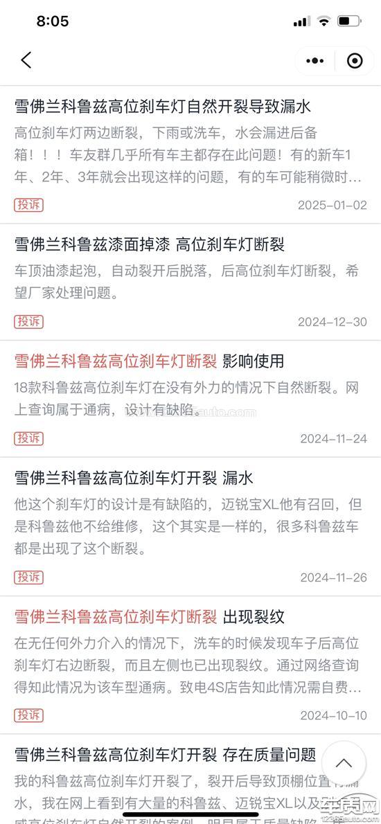 我要投诉上汽通用雪佛兰。科鲁兹,迈锐宝,别克君威都有高位刹车灯断裂,这是上汽通用质量问题而且是通病,以前迈锐宝还有召回维修更换的,为什么科鲁兹没有召回维修呢?难道说该车型停产了,就不管它的死活了吗?请雪佛兰厂家给我个合理解释。我的车基本都放在车库,从购买车到现在也才开了26000左右公里数。我可以保证我的车高位刹车灯断裂不是行驶过程中断的,是停放在车库发生的断裂,这个配件属于生产质量问题,车质网图片投诉科鲁兹全是出现高位刹车灯断裂,我这边要求厂家4s店召回科鲁兹到店进行免费更换。