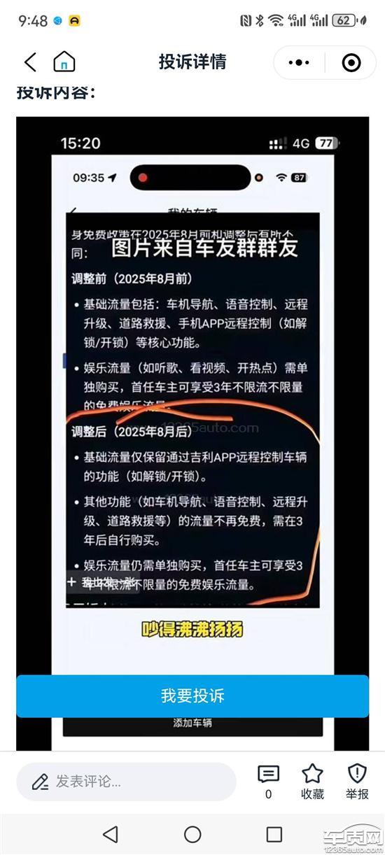 购车承诺与实际不符,存在严重误导本人于2024年12月在4S店购买了一台吉利博越L2024款汽车。在购车过程中,无论是吉利官方宣传材料(包括但不限于官网、宣传册、官方App介绍),还是4S店的销售人员,均明确、反复地向我承诺:该车型享受“基础流量终身免费“服务。销售人员及官方资料清晰地说明,该“基础流量“包含以下核心功能的使用所需流量:1语音助手唤醒与控制2:OTA(空中升级)服务3:在线导航服务:4:远程控制App功能:通过吉利汽车App实现远程解锁/上锁、启动发动机/空调、查看车辆状态等。正是基于对“基础流量终身免费涵蓋上述四大核心功能“这一承诺的信任,我才最終决定购买此款吉利博越L汽车。该承诺是影响我购车决饭的关键因素之一。二、吉利单方面擅自变更服务内容,构成违约变更后的现状:所谓的“基础流量终身免费“仅剩下“远程控制App功能“一项。语音助手唤醒、OTA升级、在线导航这三项原本明确包含在基础流量内的核心功能,被吉利单方面排除在外。