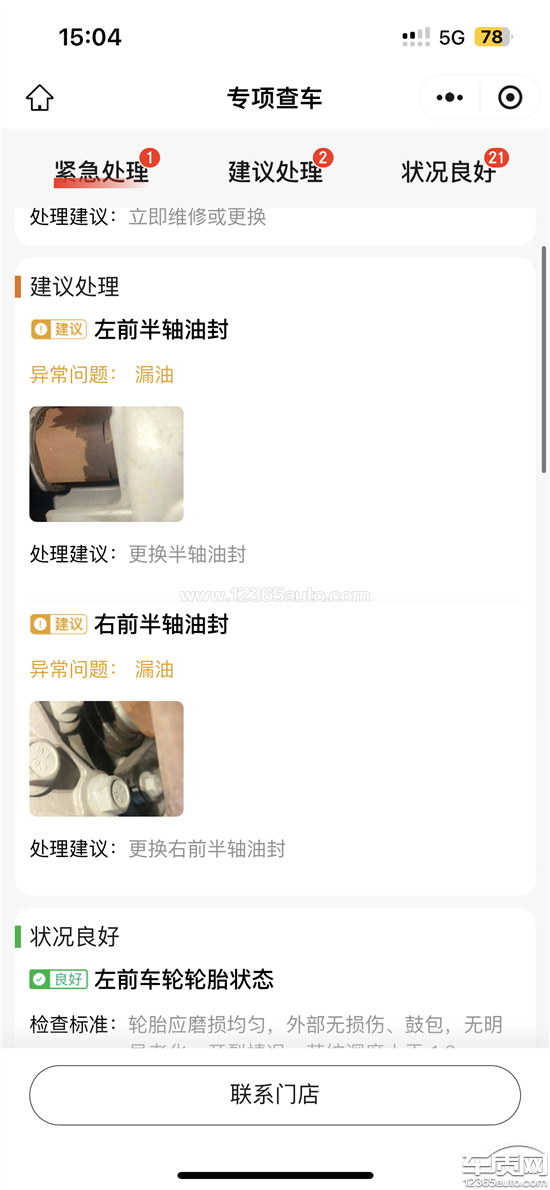 别克君威车辆前半轴油封漏油,质量问题,要求处理。